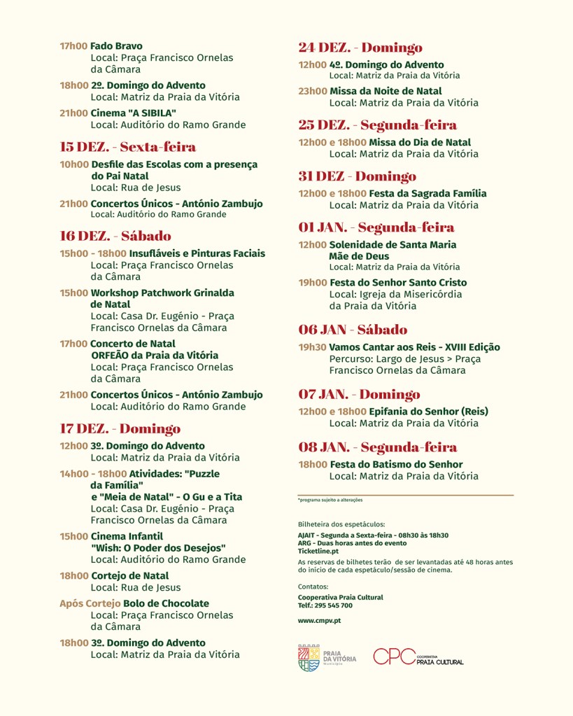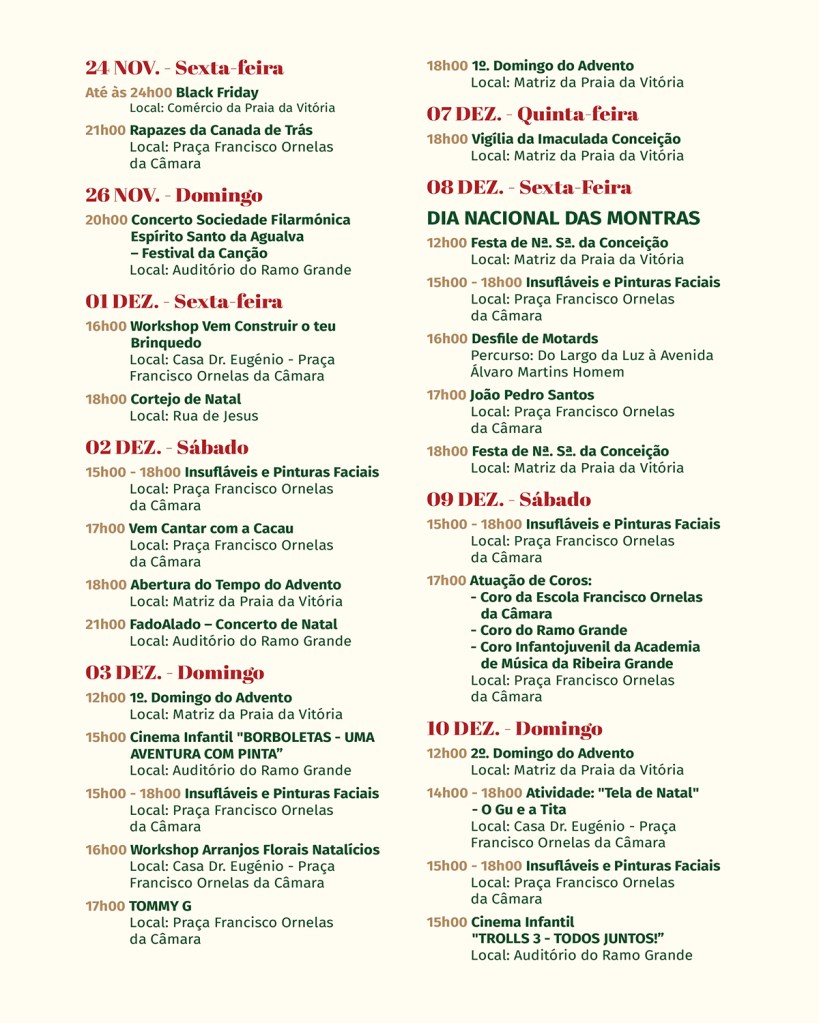 “No sábado, dia 02, das 15h00 às 18h00, teremos insufláveis e pinturas faciais na Praça Francisco Ornelas da Câmara, e às 17h00, no mesmo local, temos o concerto Vem Cantar com a Cacau. Às 18h00, decorre a cerimónia de abertura do Advento na Matriz da Praia, e a partir das 21h00, no Auditório do Ramo Grande, teremos um grande concerto de natal com os FadoAlado e as Vozes da Fonte”, adianta Paula Sousa.
