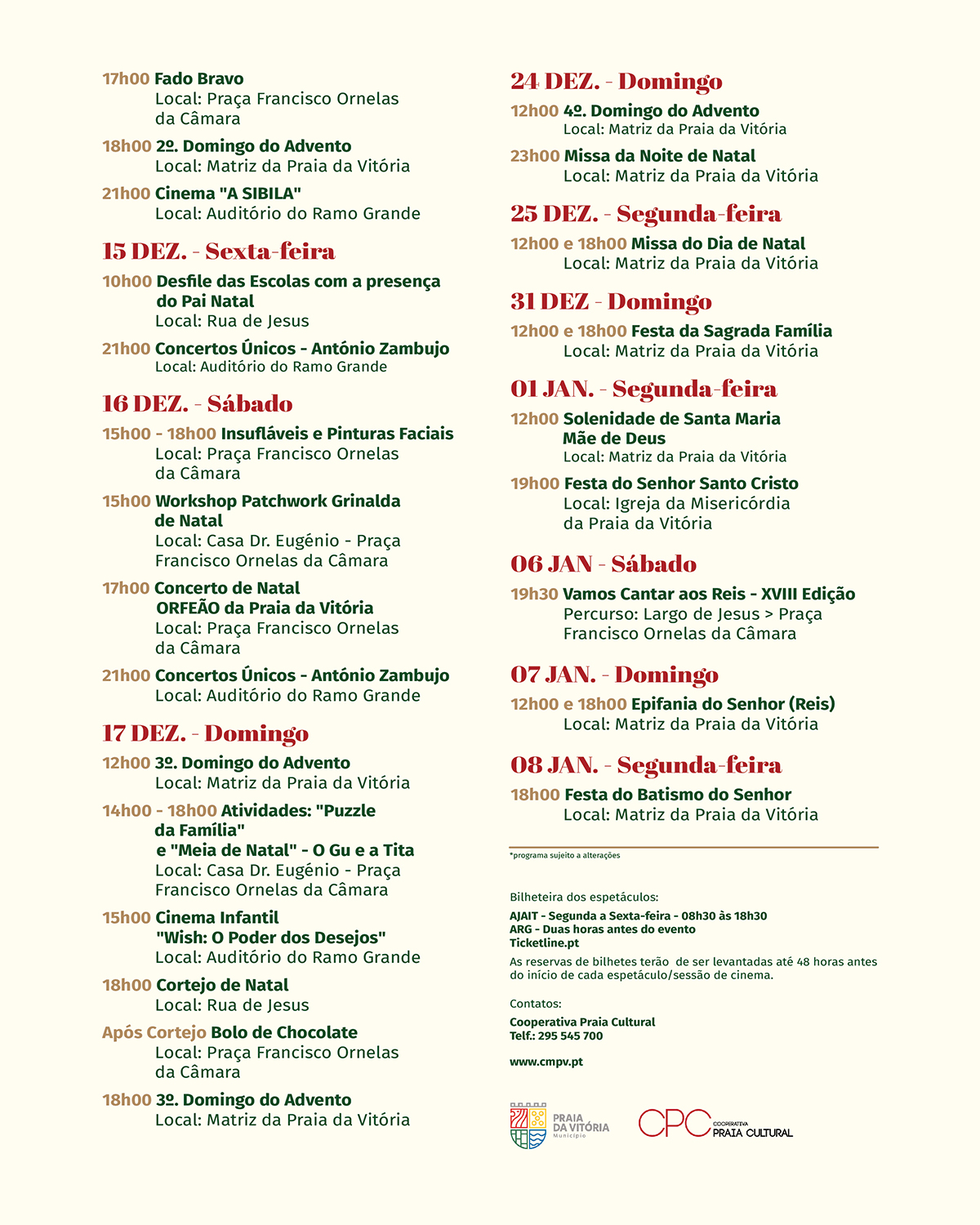 Nos dias 24, 25 e 31 de dezembro e 01 de janeiro, na Matriz da Praia, decorrem as cerimónias do 4º domingo do advento (12h00), da Missa da Noite de Natal (23h00), da Sagrada Família (12h00 e 18h00) e Solenidade de Santa Maria Mãe de Deus (12h00). Na Igreja da Misericórdia, no dia 01, às 19h00, ocorre a Festa do Senhor Santo Cristo da Misericórdia.