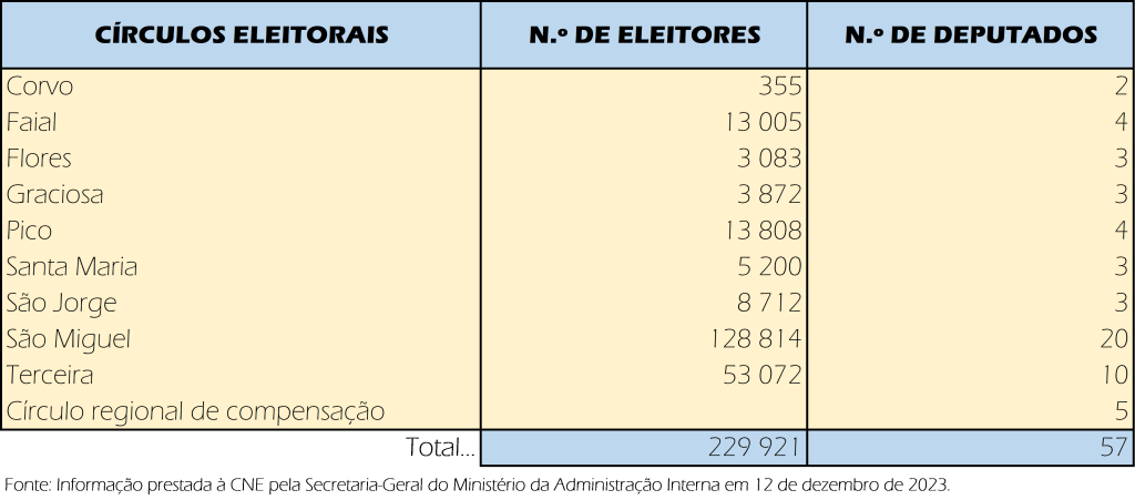 De acordo com o n.º 4 do artigo 13.º do Decreto –Lei n.º 267/80, de 8 de agosto, apresenta-se abaixo mapa com o número de deputados a eleger ALRAA e a sua distribuição pelos círculos eleitorais, conforme publicado a 13 de dezembro de 2023 pela Comissão Nacional de Eleições (CNE):