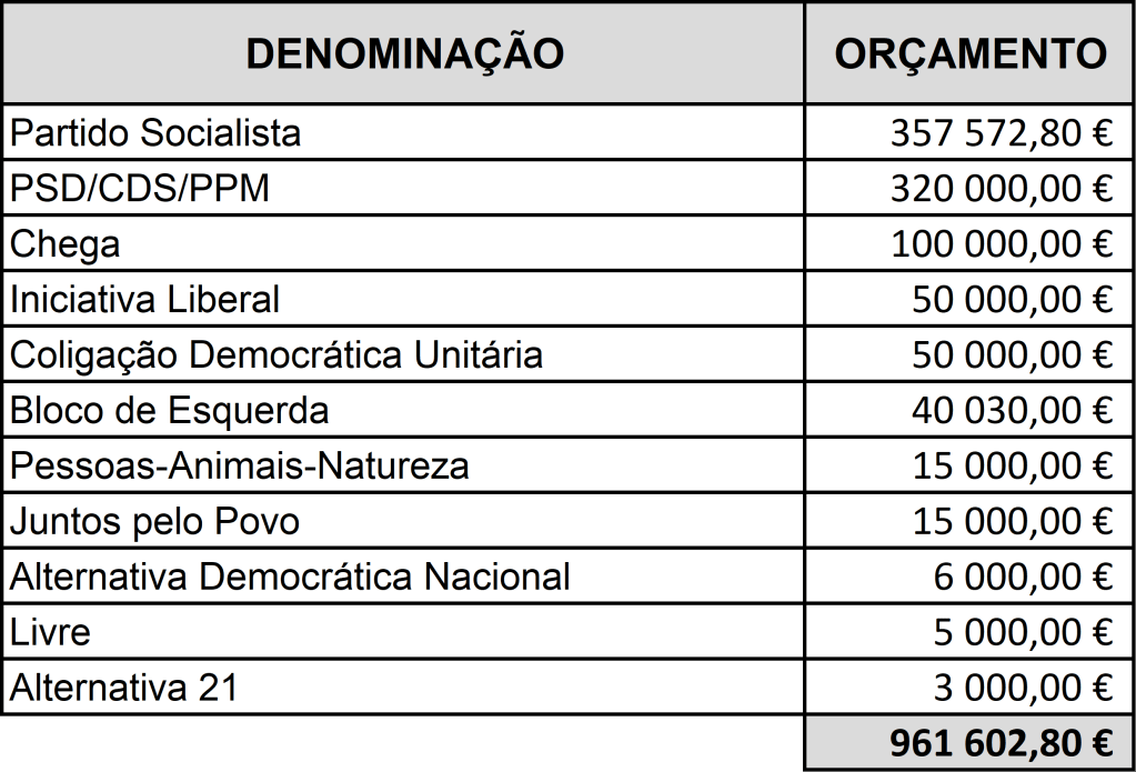 O CHEGA apresenta o terceiro orçamento mais elevado (100 mil euros), logo a segui à coligação PSD/CDS/PPM que estima gastar mais de 300 mil euros.