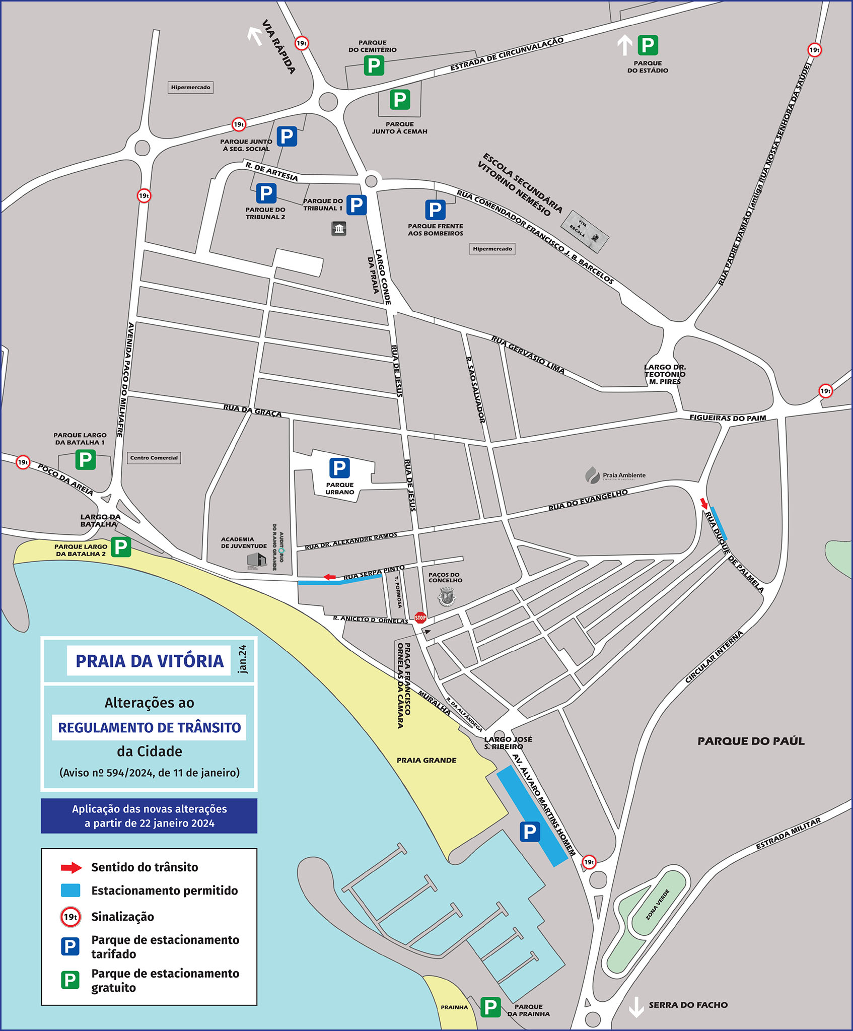 Desde a manhã desta segunda-feira, dia 22 de janeiro, e em função das alterações ao Regulamento de Trânsito da Cidade da Praia da Vitória, conforme Aviso nº594/2024, de 11 de janeiro, registam-se as seguintes mudanças na circulação e estacionamento nas vias abaixo referidas: