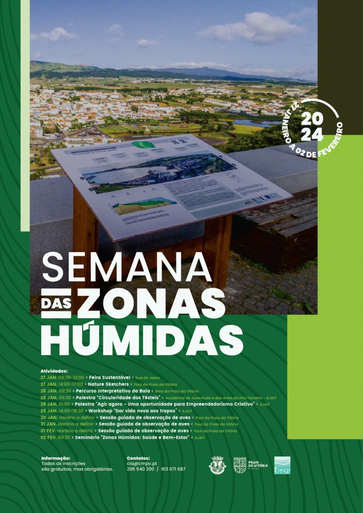 De 27 de janeiro a 02 de fevereiro, a Câmara Municipal da Praia da Vitória promove a Semana das Zonas Húmidas. Esta celebração, que pretende despertar para o potencial das zonas húmidas na Praia da Vitória, conta com a realização de uma feira, uma atividade ligada ao desenho, percursos pedestres interpretativos, palestras, um workshop, sessões de observação de aves, culminando com a realização de um seminário que estabelece uma ligação entre estas zonas húmidas e a saúde e o bem-estar público.