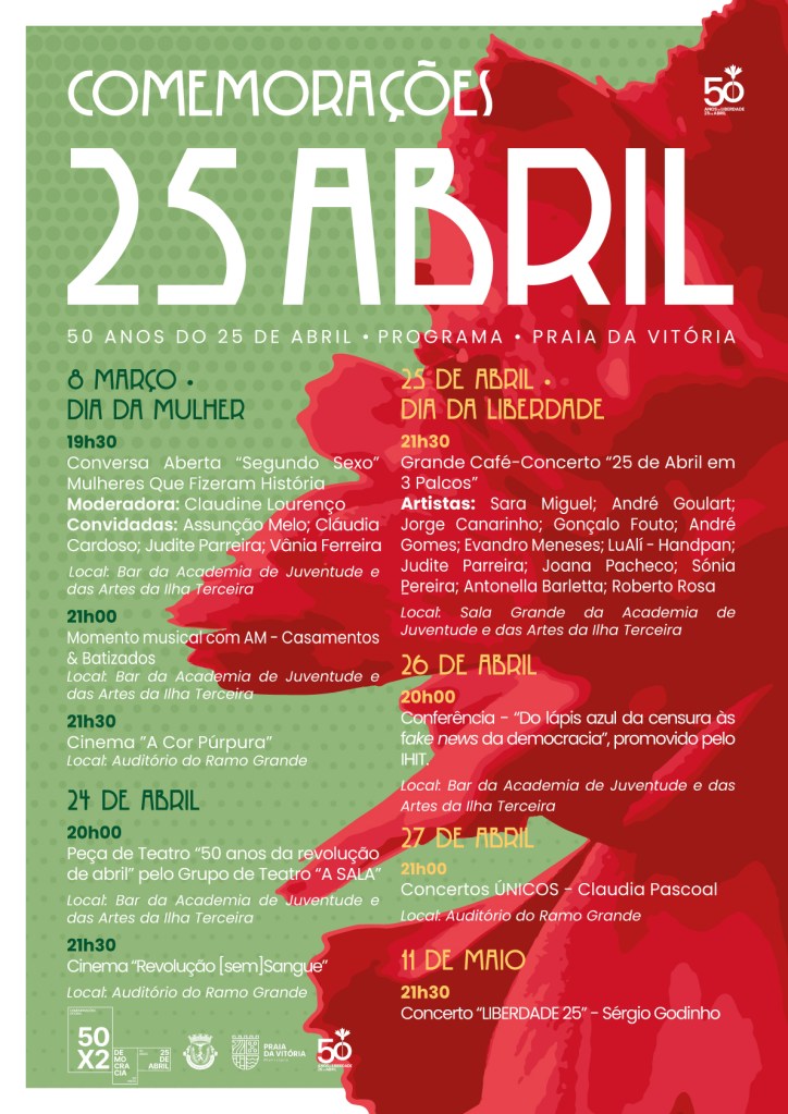 Os concertos de Sérgio Godinho “Liberdade 25”, “25 de Abril em três palcos” com vários artistas e de Cláudia Pascoal, a peça de teatro “50 anos da revolução de abril”, o filme “Revolução [sem] sangue” e uma conferência sobre a censura e as fake news são eventos programados pela Câmara Municipal da Praia da Vitória para assinalar os 50 Anos do 25 de abril. A programação foi revelada quarta-feira, dia 13, pela Autarquia em nota de imprensa.