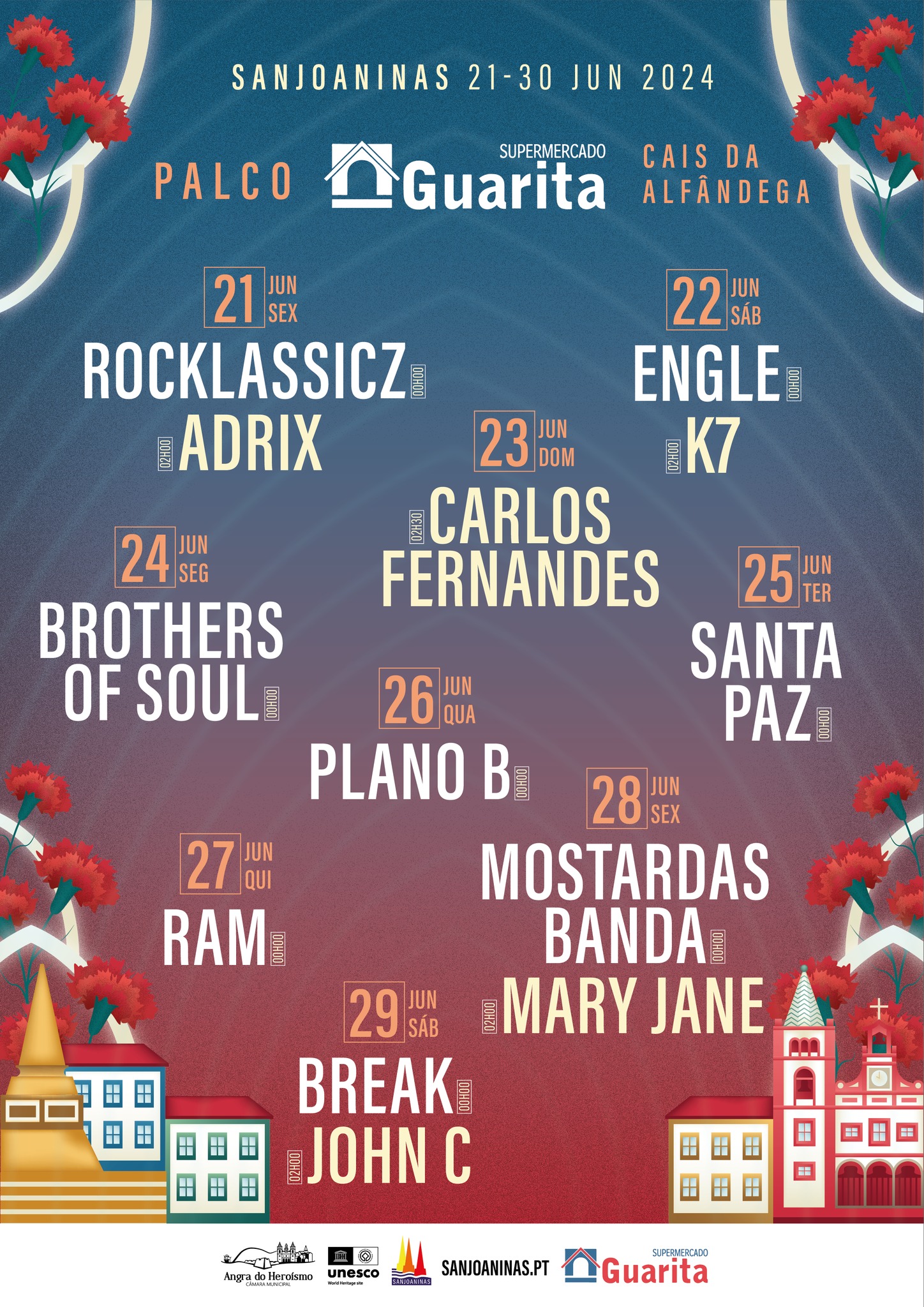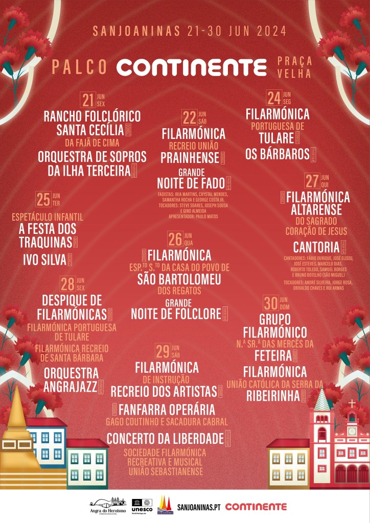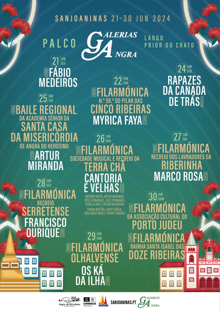 Foi esta segunda-feira, dia 13 de maio de 2024, divulgado, no sítio web do evento e na página oficial da rede social Facebook, todos os artistas que subirão aos quatros palcos das festas Sanjoaninas 2024, que decorrerão de 21 a 30 de junho, subordinadas ao tema “ANGRA: Teu nome é liberdade”, evocativo dos 50 anos da revolução dos “Cravos”.