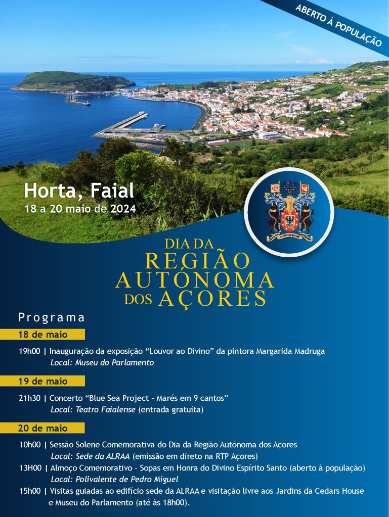 A Sessão Solene Comemorativa do Dia da Região Autónoma dos Açores 2024 celebra-se na próxima segunda-feira, 20 de maio, na sede da Assembleia Legislativa da Região Autónoma dos Açores (ALRAA), na cidade da Horta.