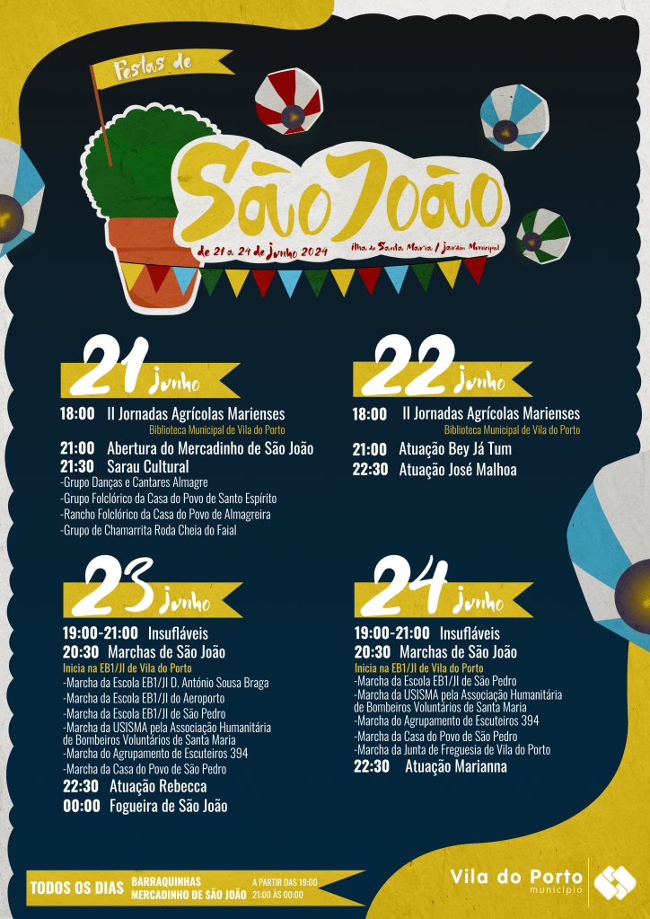 Os detalhes da programação das Festas de São João 2024 de Vila do Porto poderão ser consultados no cartaz das festividades.