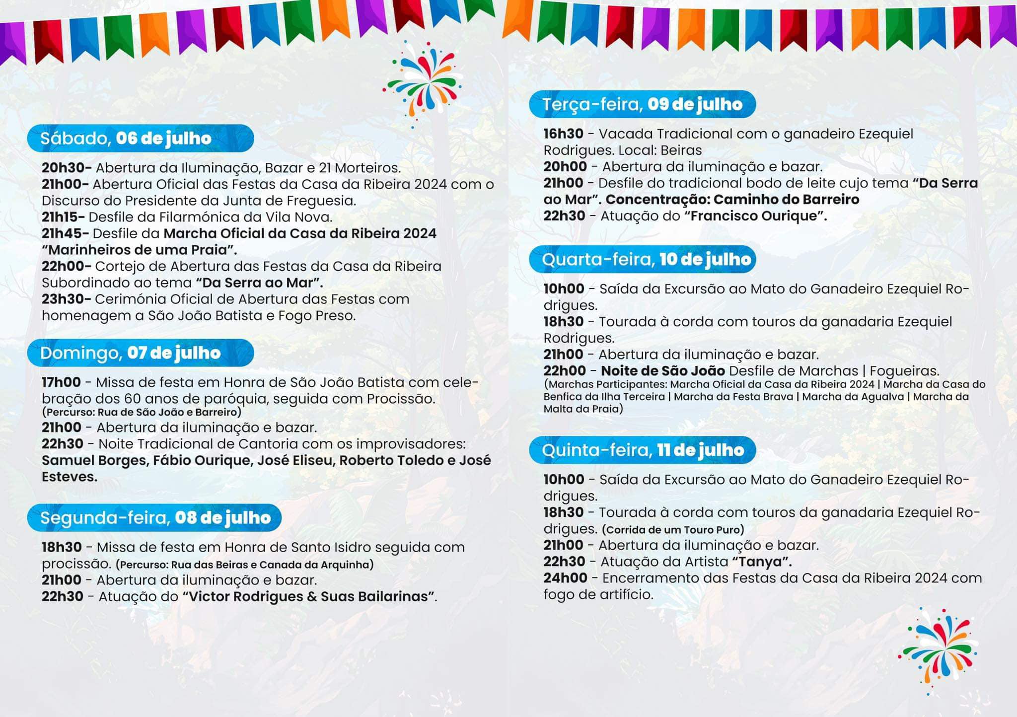 Na quinta-feira, dia 11 de julho, as festas Casa da Ribeira 2024 encerrarão com fogo-de-artifício pela meia-noite. Antes, haverá excursão ao mato, tarde de touros e atuação da artista “Tanya”.