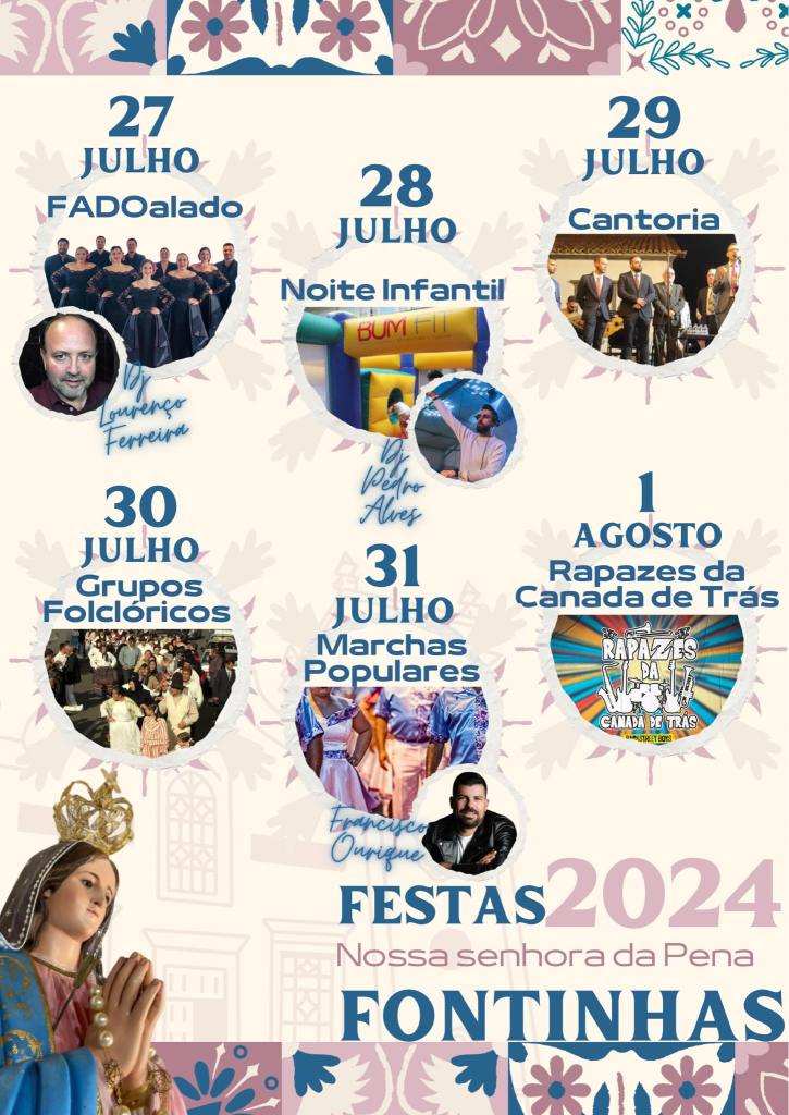 As festas em honra de Nossa Senhora da Pena 2024, na freguesia das Fontinhas, tem início no próximo sábado, dia 27 de julho, e decorrem até ao dia 02 de agosto. São sete dias para celebrar a religiosidade, a tradição e a cultura, num hino de homenagem ao convívio e à alegria.