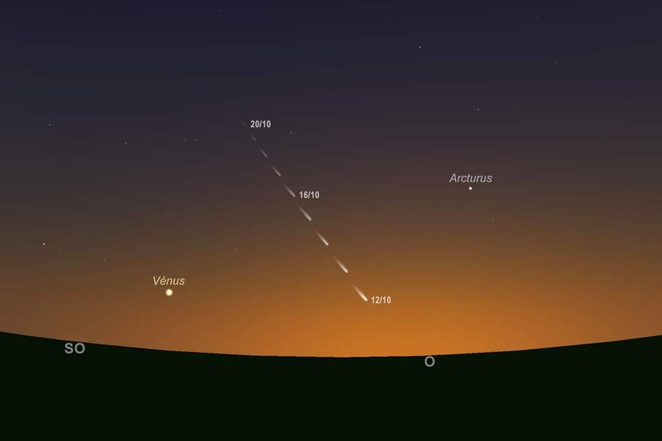 Por essa razão, em princípio o 12 de outubro será o dia ideal para tentar observar o cometa. Neste dia, procurem um local com o horizonte virado a Oeste desimpedido (o topo de um prédio alto, uma praia virada a poente ou uma serra, por exemplo). Por volta das 19h00, quando o Sol passar abaixo do horizonte, procurem o planeta Vénus à esquerda do pôr-do-Sol (a tal “superestrela”). À mesma altura do horizonte e a cerca de um palmo para a direita do planeta, deverão encontrar o cometa, que nas cidades deve parecer uma “manchinha”. Para melhor visualização, podem sempre recorrer a uns binóculos, ou tentar registar a ocasião tirando algumas fotografias de exposição. E, é claro, tentar vê-lo em céus escuros.