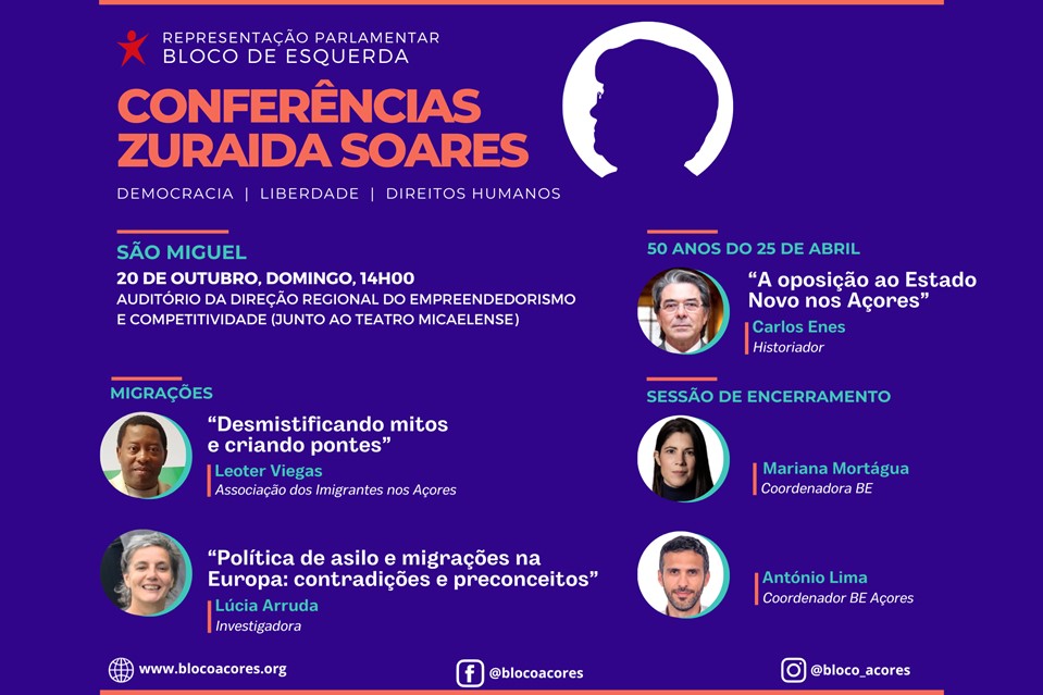 Mariana Mortágua vai estar em Ponta Delgada no segundo dia das Conferências Zuraida Soares 2024, no próximo domingo, dia 20 de outubro, a partir das 14h00, no auditório da Direção Regional do Empreendedorismo e Competitividade (junto ao Teatro Micaelense). O evento vai assinalar os 50 anos do 25 de Abril e colocar em debate o tema das migrações, quer no contexto dos Açores, quer a nível internacional.