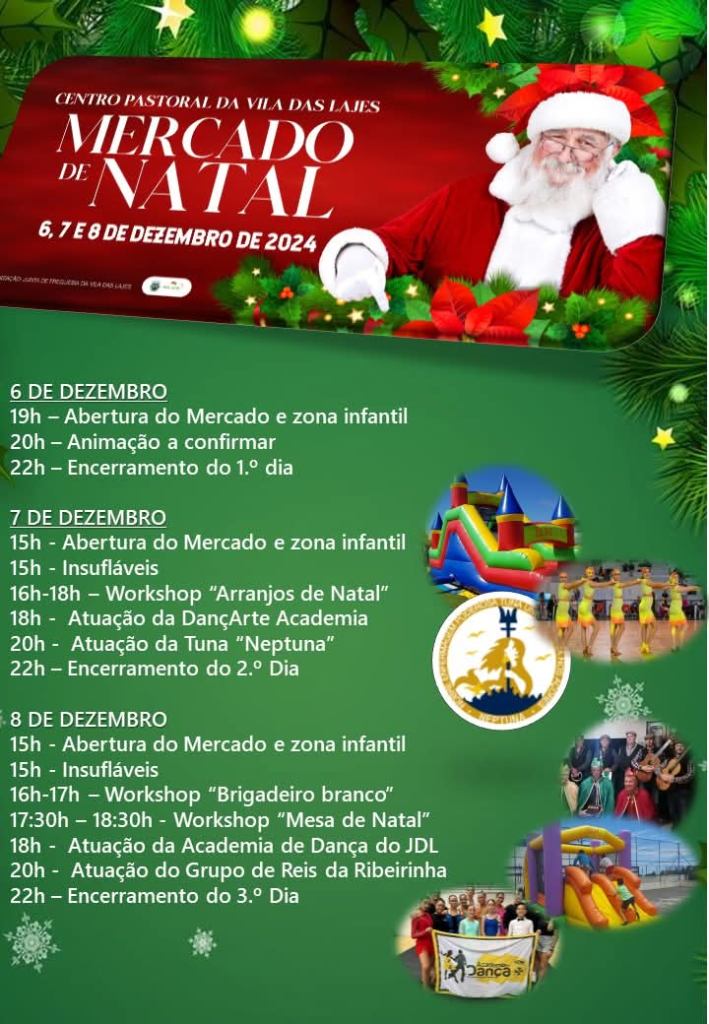 A vila das Lajes leva a efeito, este fim de semana, um Mercado de Natal, no Centro Pastoral e Social da vila, localizado atrás da Igreja Paroquial de São Miguel Arcanjo. A realização deste Mercado de Natal integra a programação natalícia da vila das Lajes que arrancou no passado domingo com a abertura da decoração e iluminação.