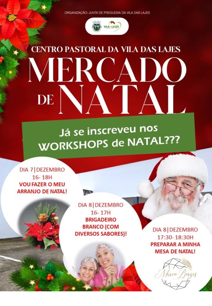 Já hoje, o Mercado de Natal da vila das Lajes funcionará entre as 19h00 e as 22h00, enquanto amanhã e no domingo estará aberto das 15h00 às 22h00. O evento contempla animação, insufláveis, barraquinhas e uma tasquinha, decorrendo ainda vários workshops, designadamente, “Vou fazer o meu arranjo de Natal”, “Brigadeiro branco (com diversos sabores)” e “Preparar a minha mesa de Natal”.