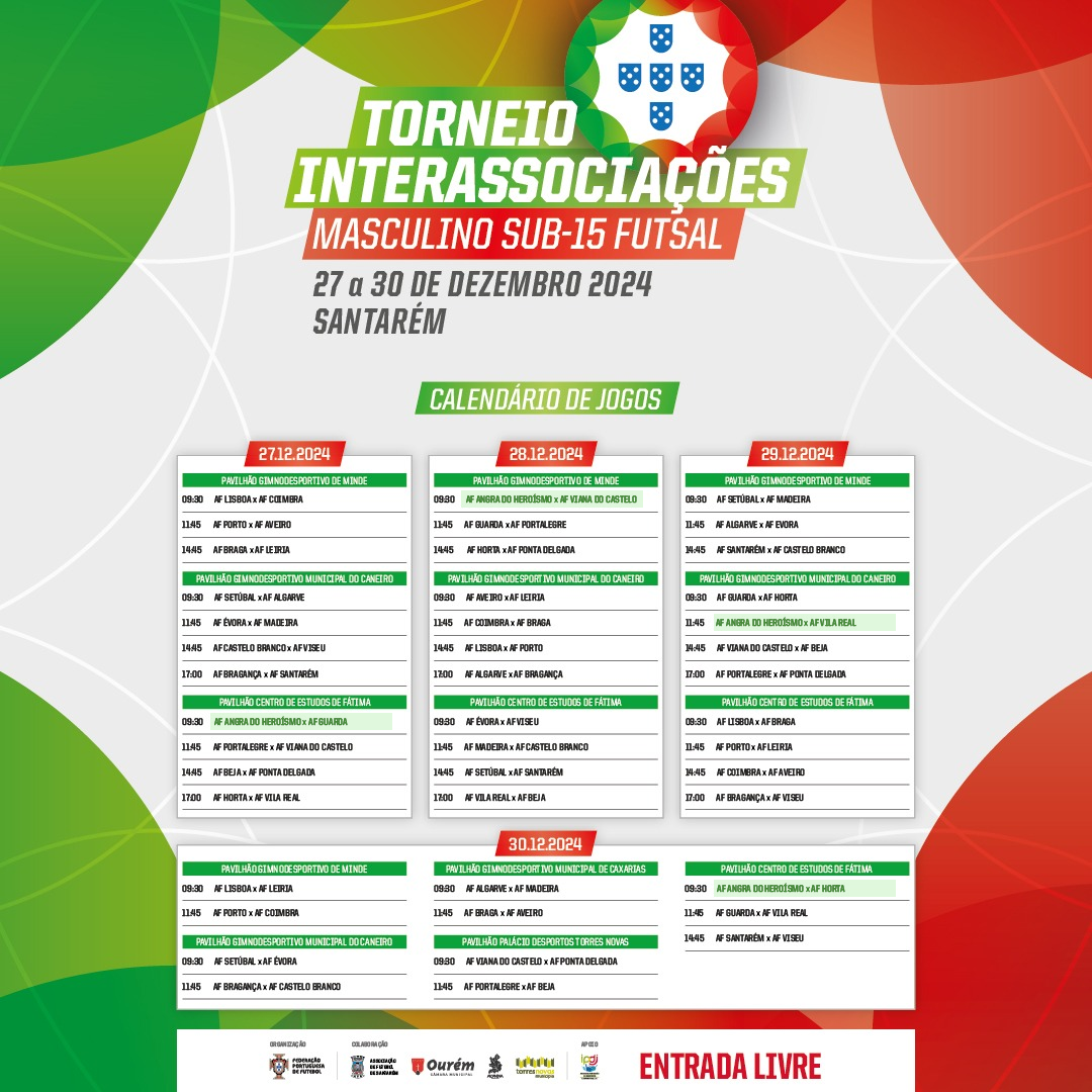 O conjunto de Angra terá pela frente quatro encontros. No dia 27, pelas 09h30, medirá forças com a Seleção da AF Guarda. No dia seguinte, dia 28, à mesma hora, terá o seu segundo jogo, desta feita, perante o conjunto de Viana do Castelo. No terceiro dia da prova, com início agendado para as 11h45, a Seleção da AF Angra do Heroísmo jogará com a congénere de Vila Real. A finalizar a sua participação, no dia 30, pelas 09h30, embate com o conjunto da AF Horta.