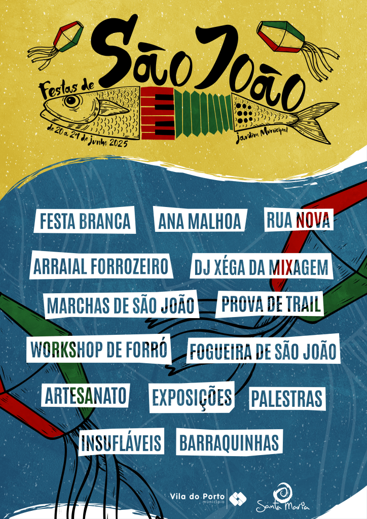 O Município de Vila do Porto, em Santa Maria, revelou esta segunda-feira o cartaz das Festas de São João 2025, que terão lugar entre os dias 20 e 24 de junho, no Jardim Municipal. O evento promete animar a ilha de Santa Maria com um programa diversificado que inclui música, tradição e atividades desportivas e culturais.