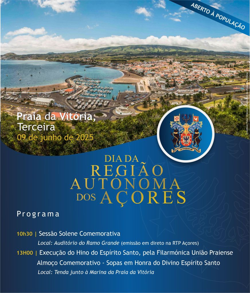 A Sessão Solene Comemorativa do Dia da Região Autónoma dos Açores terá lugar no próximo dia 9 de junho, segunda-feira, no Auditório do Ramo Grande, na Praia da Vitória, ilha Terceira. A cerimónia, com início marcado para as 10h30, assinala oficialmente o feriado regional e será marcada por intervenções políticas e pela atribuição de distinções honoríficas.
