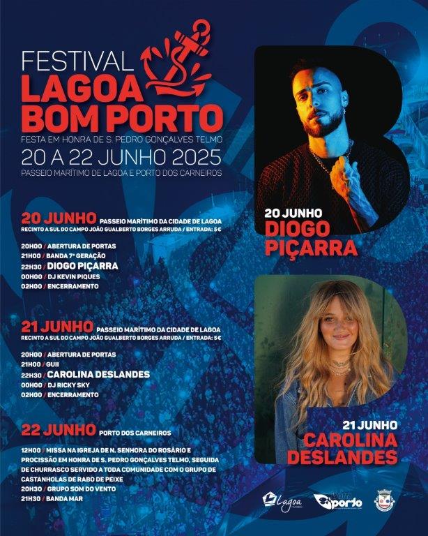 A cidade de Lagoa, na ilha de São Miguel, acolhe entre 20 e 22 de junho o Festival Lagoa Bom Porto – Festa em Honra de S. Pedro Gonçalves Telmo, com Diogo Piçarra e Carolina Deslandes como cabeças de cartaz. O evento, organizado pela Câmara Municipal de Lagoa com o apoio da Associação de Pescadores de Lagoa Bom Porto, alia tradição religiosa, gastronomia e música, com atuações de artistas locais e nacionais.