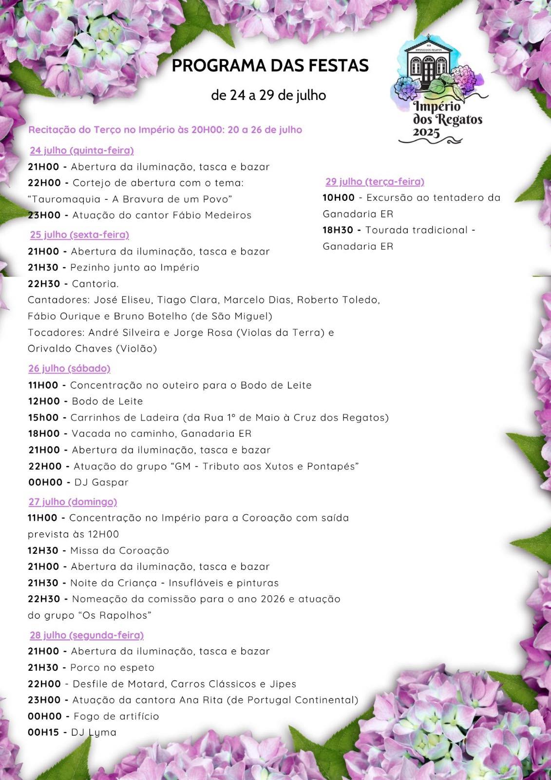 O programa completo está disponível nas plataformas digitais das Festas do Império dos Regatos 2025.