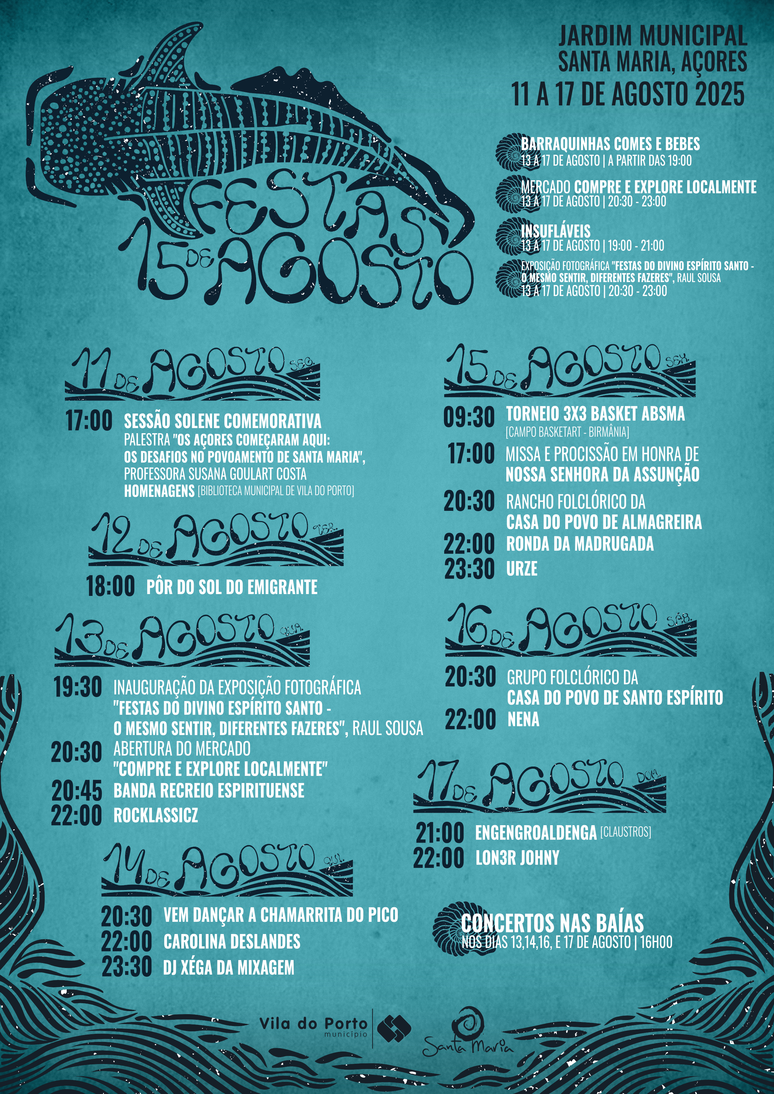 A Câmara Municipal de Vila do Porto anunciou esta terça-feira, 22 de julho, através de nota de imprensa, o cartaz das Festas 15 de Agosto, que decorrem entre os dias 11 e 17 de agosto, em honra de Nossa Senhora da Assunção, padroeira da vila e símbolo central desta celebração anual. O programa, segundo a autarquia, combina tradição, cultura, homenagens e um cartaz musical pensado para todas as idades.