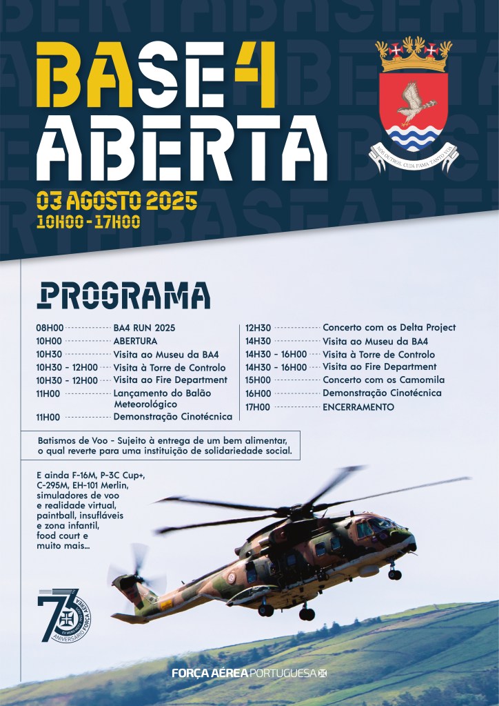 No âmbito das comemorações do 73.º Aniversário da Força Aérea, a Base Aérea N.º 4 (BA4), situada nas Lajes, promove este domingo, 3 de agosto, um Dia de Base Aberta, com um programa diversificado que inclui exibições aéreas, experiências imersivas com simuladores de voo e realidade virtual, visitas guiadas e atividades para todas as idades.