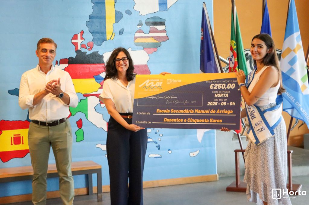 A entrega simbólica do cheque decorreu nas instalações da escola, num momento que contou com a presença do Presidente da Câmara Municipal da Horta, Carlos Ferreira, da Vereadora Maria Antónia Dutra, da Presidente do Conselho Executivo da escola, Regina Pinto, bem como de professores e técnicos da instituição.