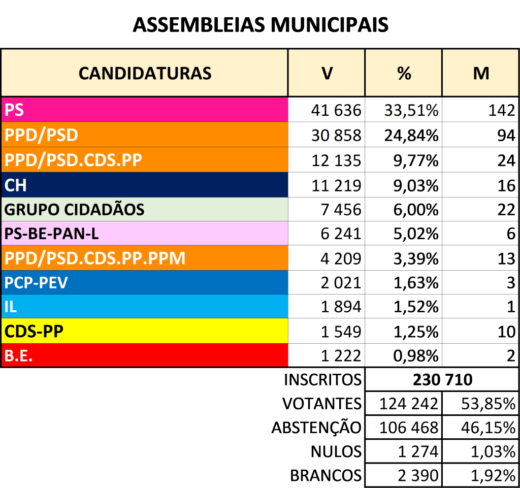 Nas câmaras municipais, o Partido Socialista (PS) conquistou 51 mandatos, enquanto o PSD, concorrendo isoladamente, assegurou 33. A tendência manteve-se nas assembleias municipais, com o PS a eleger 142 deputados, face aos 94 do PSD em listas próprias. A mesma dinâmica verificou-se nas assembleias de freguesia, onde o PS obteve 527 mandatos, superando os 414 conquistados pelo PSD concorrendo sozinho.