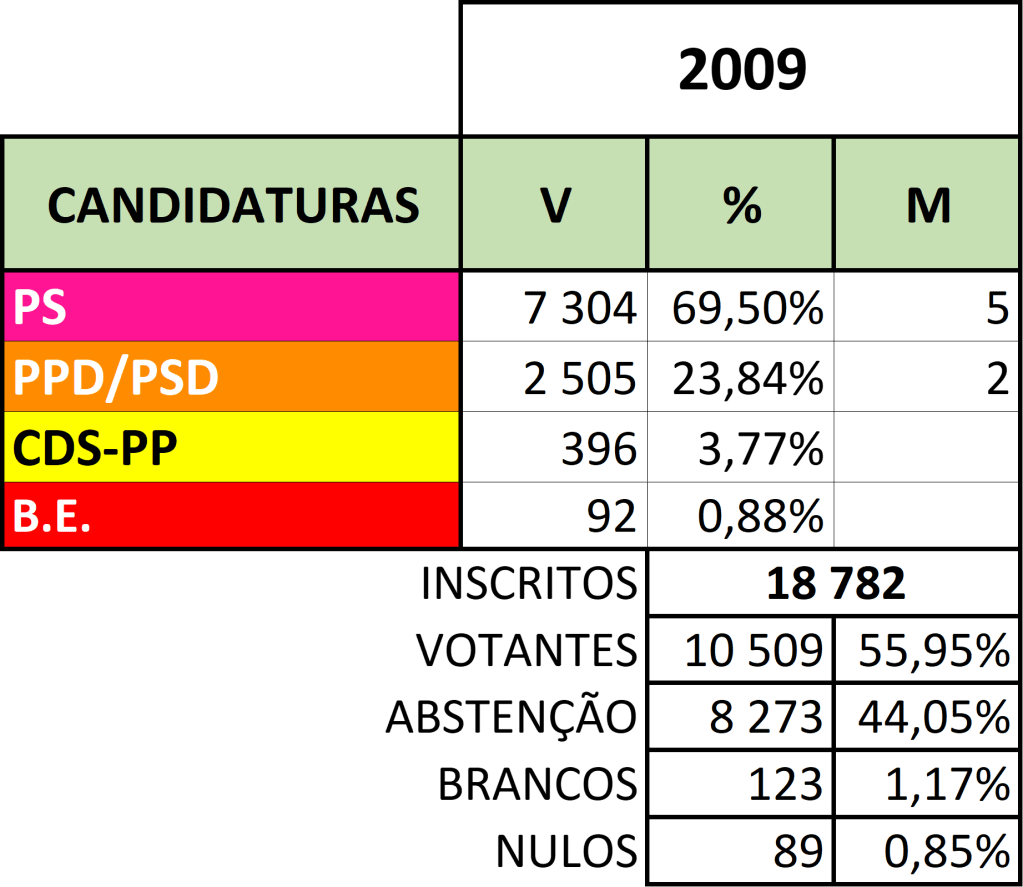 Doze anos depois, em 2009, o socialista Roberto Monteiro conquistou a vitória mais expressiva de sempre desde que há registos oficiais publicados em Diário da República (1989), ao obter 7.304 votos (69,50%) e uma maioria de cinco vereadores, contra dois do PSD, que somou 2.505 votos (23,84%). Nesse sufrágio, com 18.872 eleitores inscritos, votaram 55,95%, registando-se uma abstenção de 44,05%. O CDS-PP obteve 396 votos (3,77%), e o Bloco de Esquerda, 92 votos (0,88%).