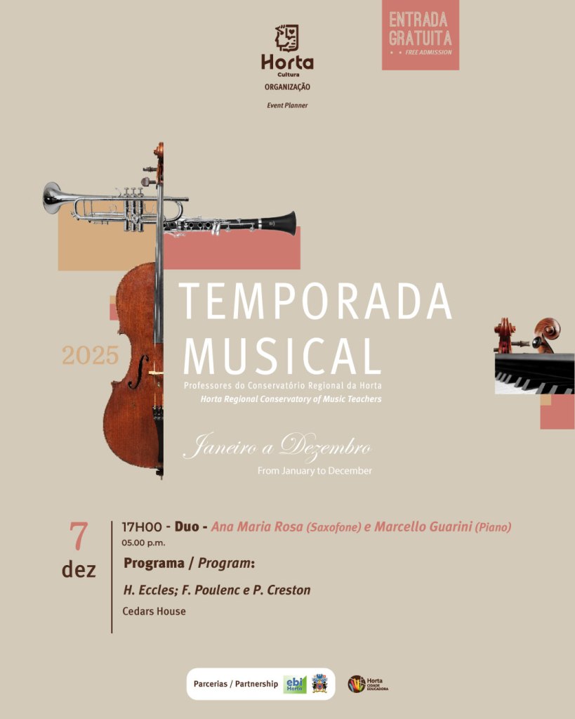 De acordo com a nota de imprensa divulgada ontem, quinta-feira, 4 de dezembro de 2025, pela Assembleia Legislativa da Região Autónoma dos Açores, o concerto terá lugar na Cedars House – Residência Oficial do Presidente da ALRAA – e integra a programação natalícia promovida pela Câmara Municipal da Horta.