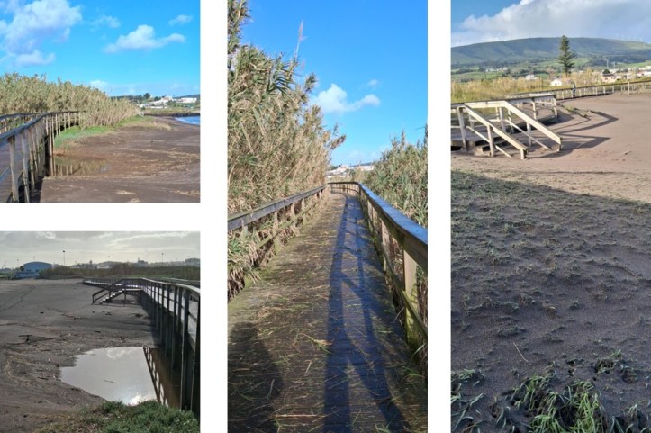 Inconformado com a primeira surpresa, prossegui a minha caminhada em direção à praia da Riviera. Embora se visse muita folhagem do caniçal abalado pelo vento da noite passada, tudo aparentava normalidade até chegar ao largo que dá acesso ao Passadiço, recentemente construído com pompa e circunstância, como se costuma dizer…