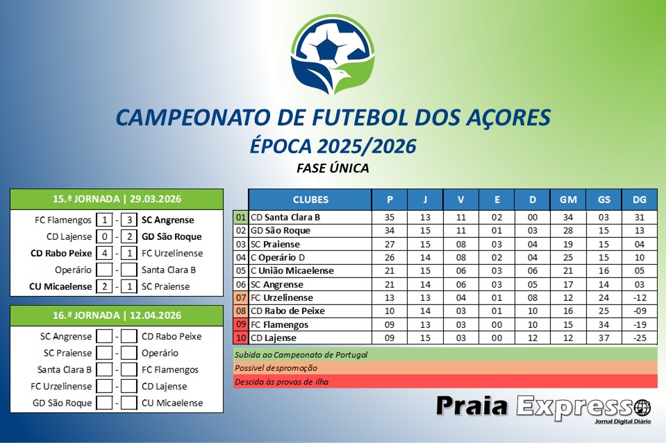 O Campeonato de Futebol dos Açores (CFA), em seniores masculinos, época 2025/2026, prosseguiu este fim de semana, com a realização da 15.ª jornada.