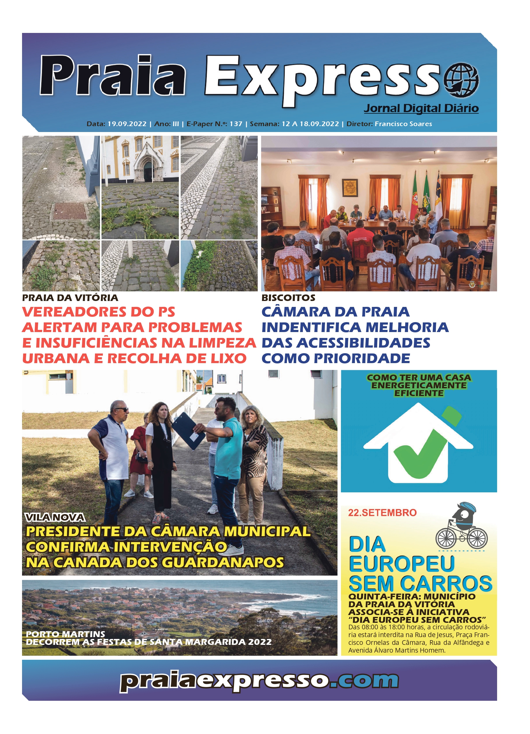 No próximo dia 22 de setembro, quinta-feira, o Município da Praia da Vitória vai associar-se à iniciativa “Dia Europeu sem Carros”, no âmbito da Semana Europeia da Mobilidade.