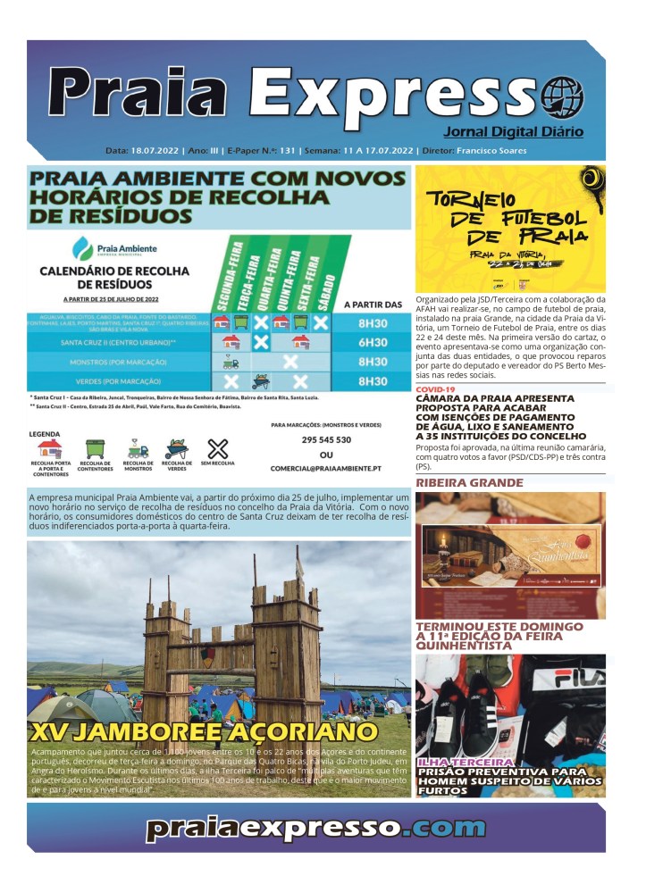 A empresa municipal Praia Ambiente vai, a partir do próximo dia 25 de julho, implementar um novo horário no serviço de recolha de resíduos no concelho da Praia da Vitória. Com o novo horário, os consumidores domésticos do centro de Santa Cruz deixam de ter recolha de resíduos indiferenciados porta-a-porta à quarta-feira.