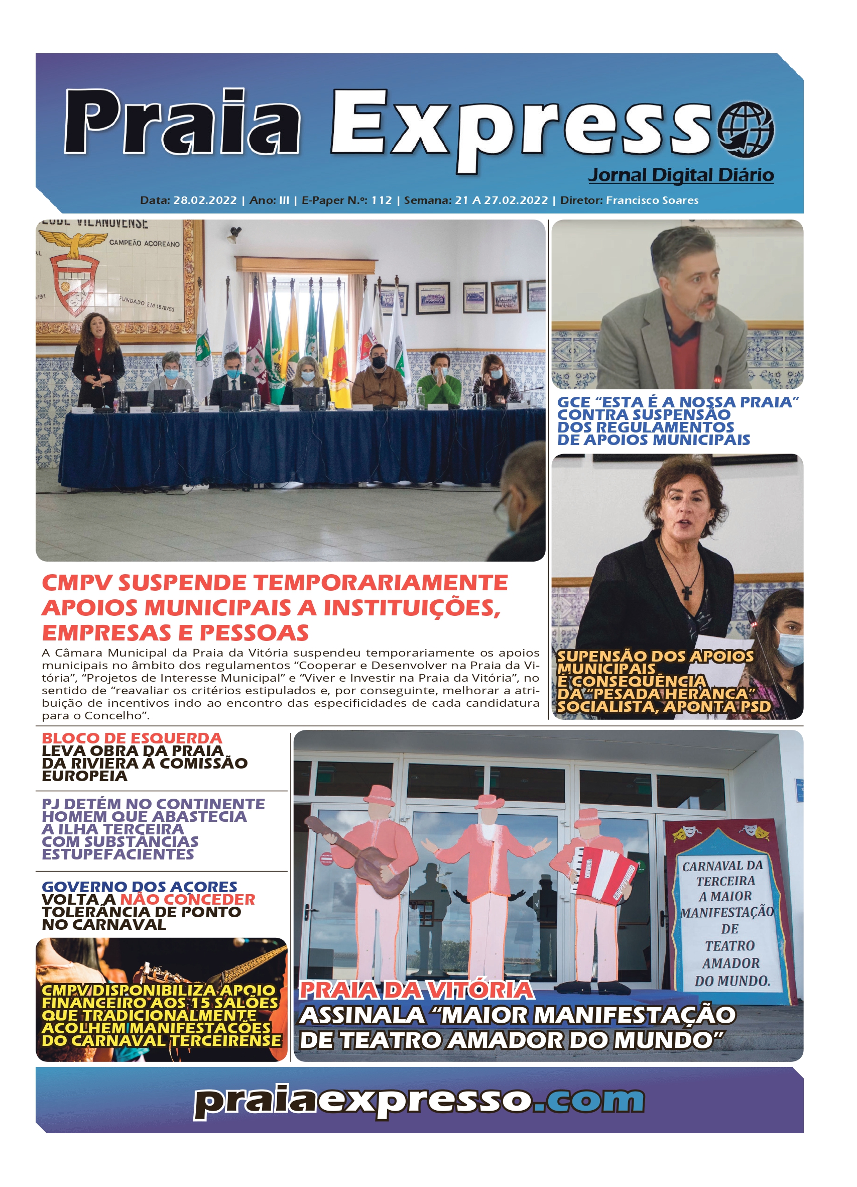 A Câmara Municipal da Praia da Vitória suspendeu temporariamente os apoios municipais no âmbito dos regulamentos “Cooperar e Desenvolver na Praia da Vitória”, “Projetos de Interesse Municipal” e “Viver e Investir na Praia da Vitória”, no sentido de “reavaliar os critérios estipulados e, por conseguinte, melhorar a atribuição de incentivos indo ao encontro das especificidades de cada candidatura para o Concelho”.