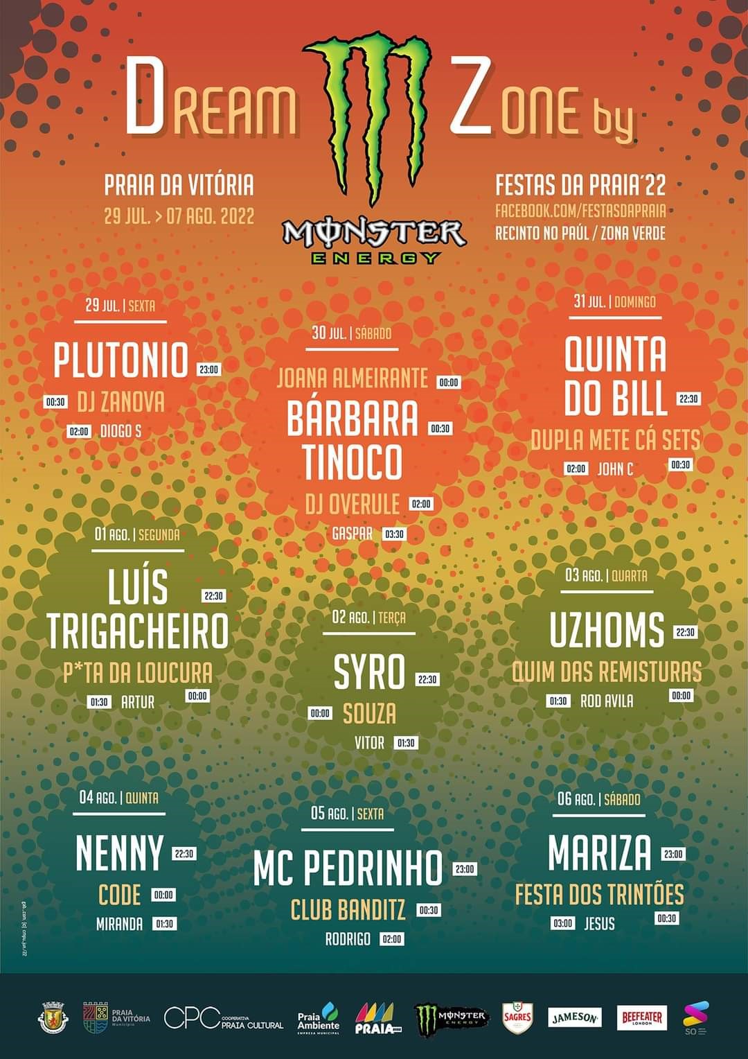 Mc Pedrinho, Mariza, Bárbara Tinoco, Quinta do Bill e Syro são alguns dos nomes sonantes que marcam presença na Dream Zone by Monster Energy. Estão ainda previstos momentos musicais neste palco, protagonizados por Plutonio, Joana Almeirante, Luís Trigacheiro, Uzhoms e Nenny. A Feira de Gastronomia do Atlântico conta com a participação de sete restaurantes, três charcutarias, três pastelarias, e dois espaços representativos de diversos pontos do País, da Madeira e da Ilha Terceira.