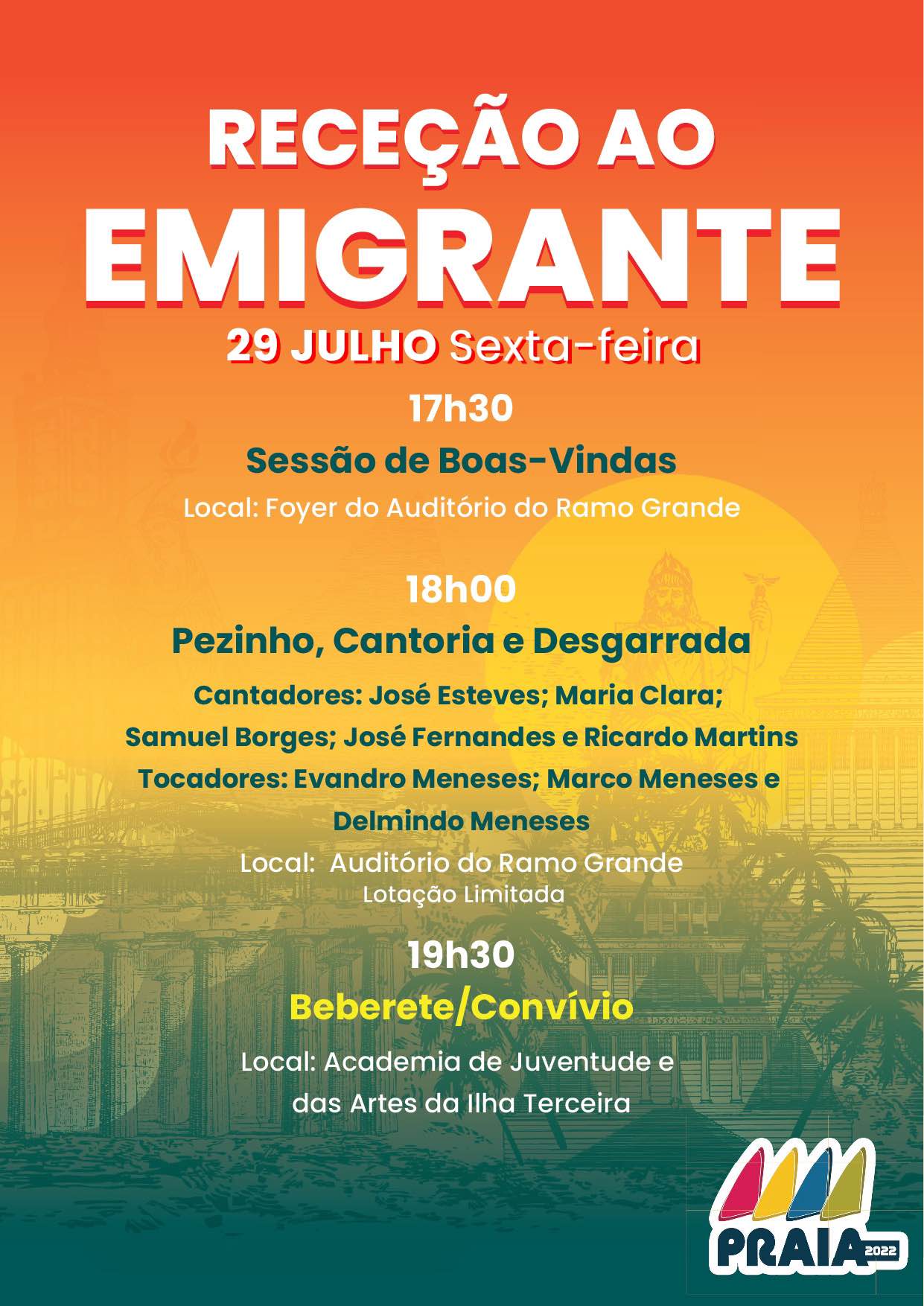 À semelhança da última edição (2019), as Festas da Praia 2022 dão as boas-vindas aos emigrantes com a promoção do evento “Receção ao Emigrante”. O evento está agendado para o primeiro dia das festividades, 29 de julho, decorrendo este ano em espaço fechado, contrariamente à última edição, repartido entre o Auditório do Ramo Grande e a Academia de Juventude da Ilha Terceira. Saber +.