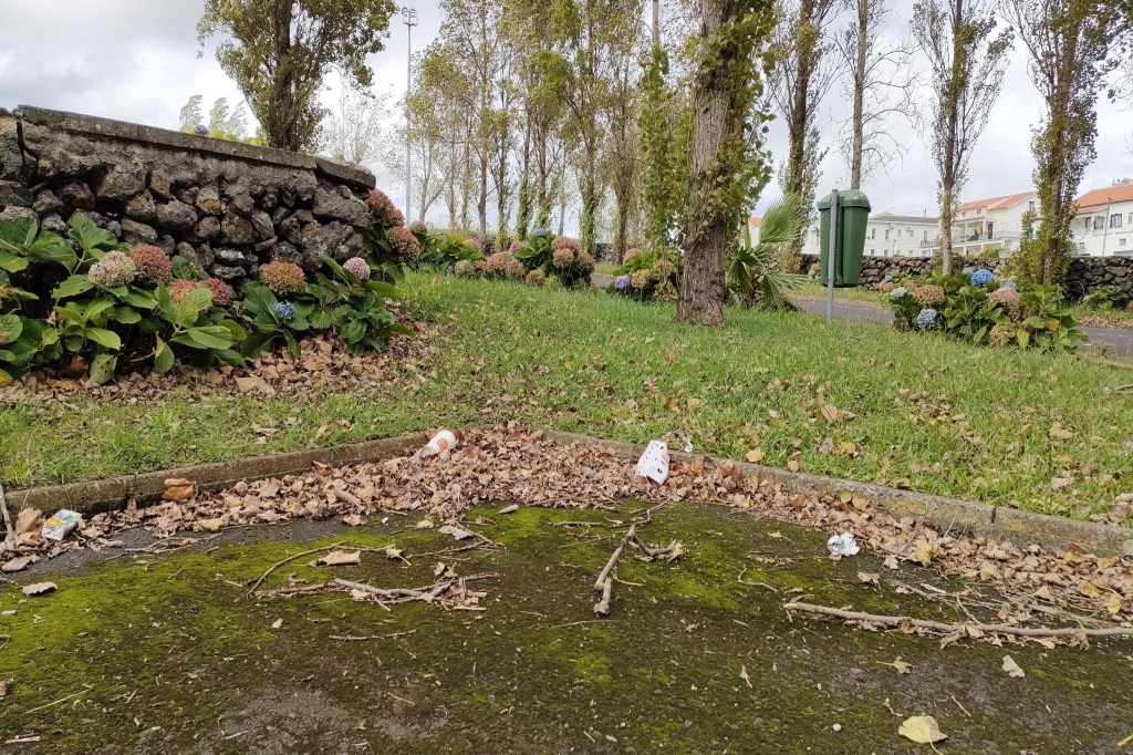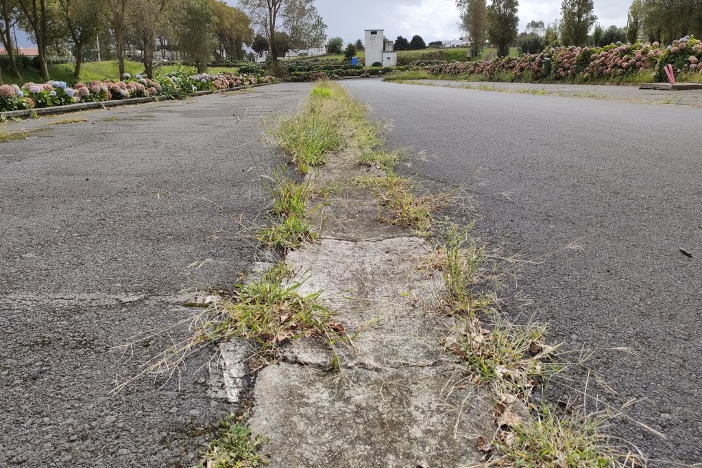 No parque de estacionamento do Estádio Municipal da Praia da Vitória, os carros não são muitos, mas, em contrapartida, o que menos falta são ervas e lixo, como bem ilustram as imagens.