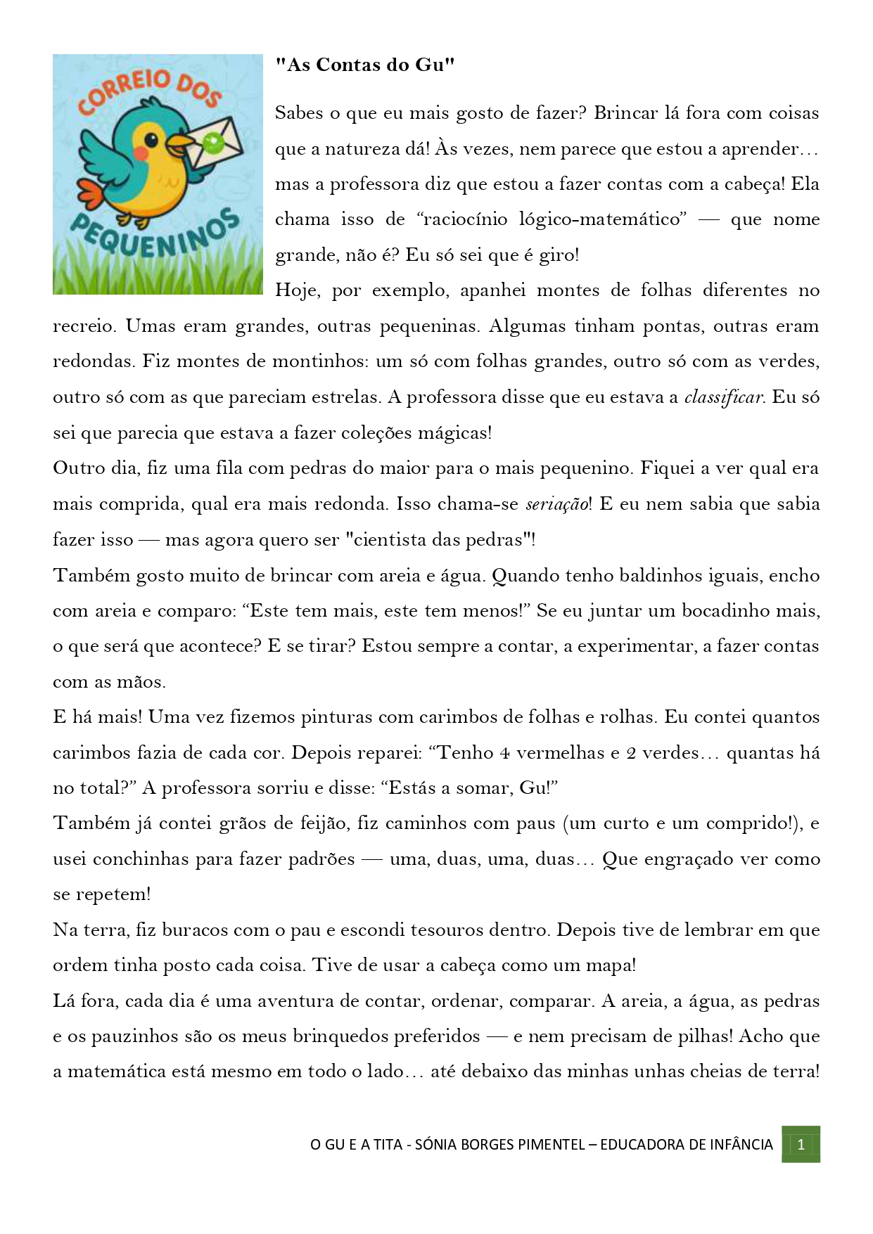 Sabes o que eu mais gosto de fazer? Brincar lá fora com coisas que a natureza dá! Às vezes, nem parece que estou a aprender… mas a professora diz que estou a fazer contas com a cabeça! Ela chama isso de “raciocínio lógico-matemático” — que nome grande, não é? Eu só sei que é giro!