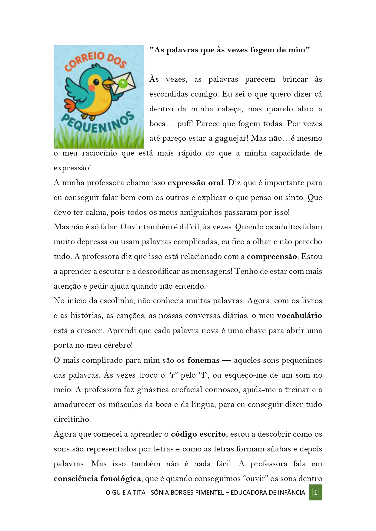 Mas não é só falar. Ouvir também é difícil, às vezes. Quando os adultos falam muito depressa ou usam palavras complicadas, eu fico a olhar e não percebo tudo. A professora diz que isso está relacionado com a compreensão. Estou a aprender a escutar e a descodificar as mensagens! Tenho de estar com mais atenção e pedir ajuda quando não entendo.