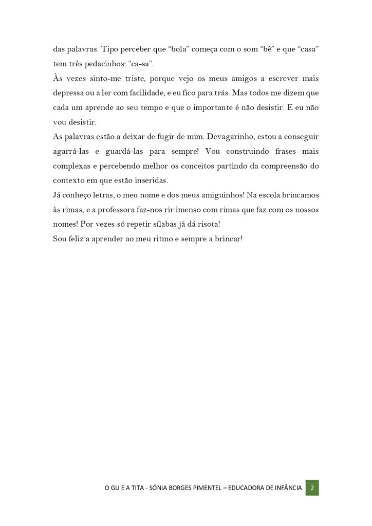 Às vezes sinto-me triste, porque vejo os meus amigos a escrever mais depressa ou a ler com facilidade, e eu fico para trás. Mas todos me dizem que cada um aprende ao seu tempo e que o importante é não desistir. E eu não vou desistir.