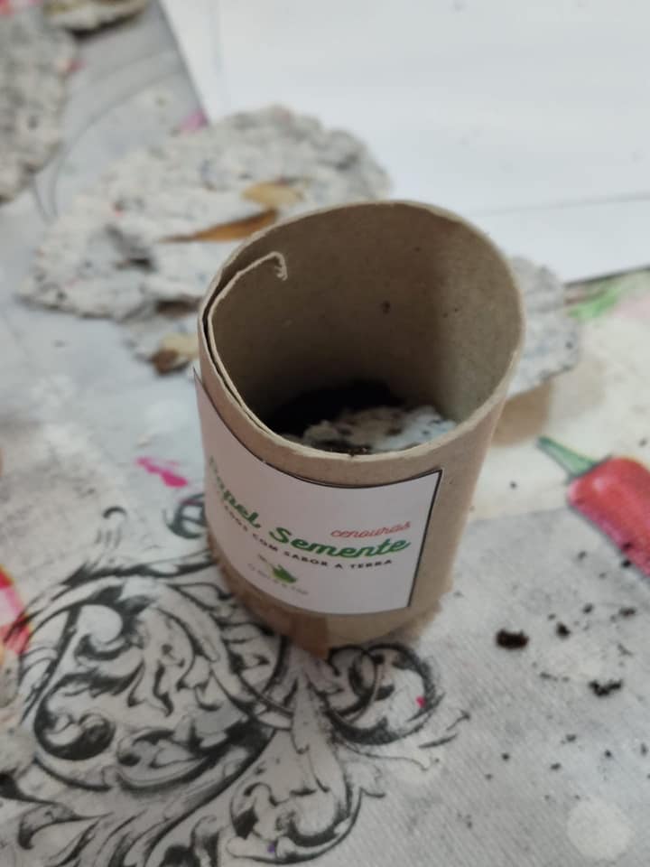 - Cortar o papel semente e depositar dentro do rolo com a terra;