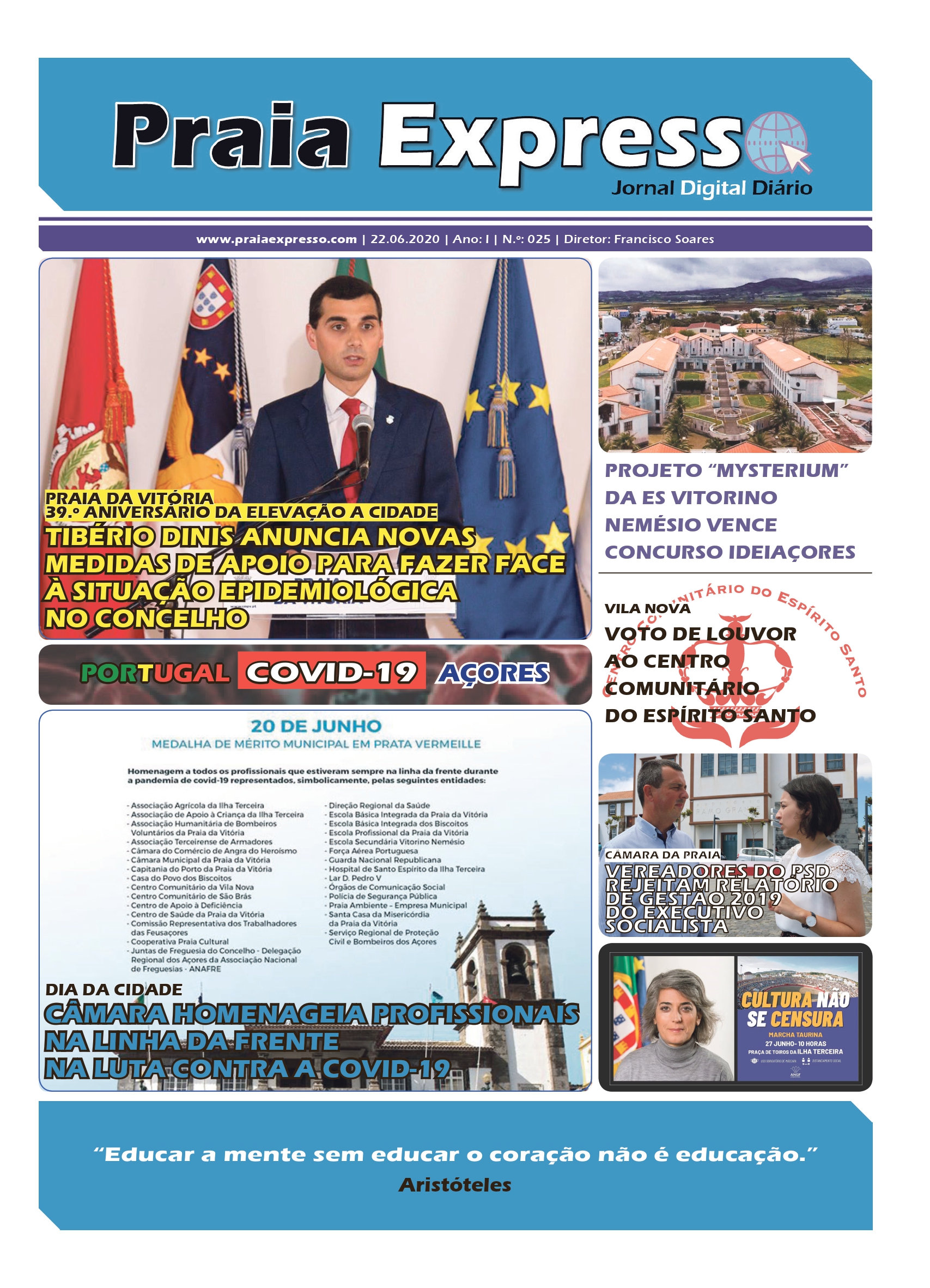 Ao discursar na cerimónia comemorativa do 39.º aniversário da elevação da Praia da Vitória a cidade, no passado sábado, 20 de junho, nos Paços do Concelho, o presidente da Câmara Municipal da Praia da Vitória, Tibério Dinis, anunciou novas de medidas de apoio às famílias, instituições e empresas do concelho para fazer face à situação epidemiológica a vigorar até ao final do ano.